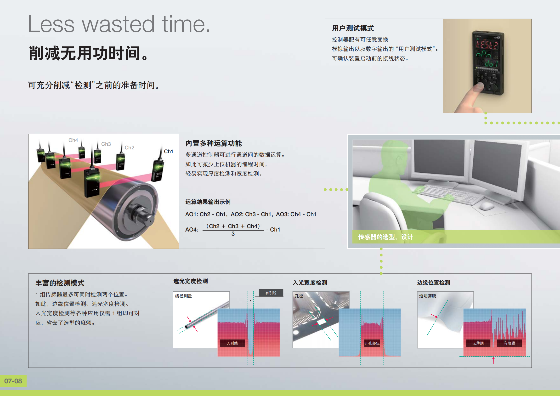 CMOS线性图像传感器:内置高灵敏度CMOS线性图像传感器,可实现高精度、高速的位置检测,分辨率高达0.1μm,检测周期仅为250μs。